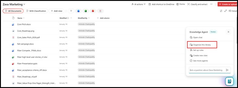 1. After you have enabled Knowledge Agent in your M365 tenant, navigate to the document library, and click on the icon on the bottom right of the screen. Next click on the Organize this library menu.