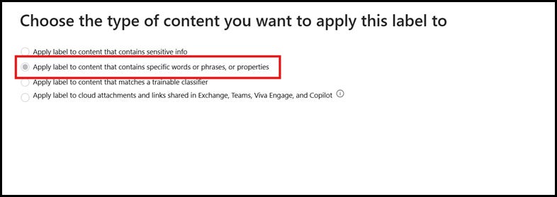 After you provide name and description for this policy, click Next. In this page, select Apply label to content that contains specific words, or phrases or properties